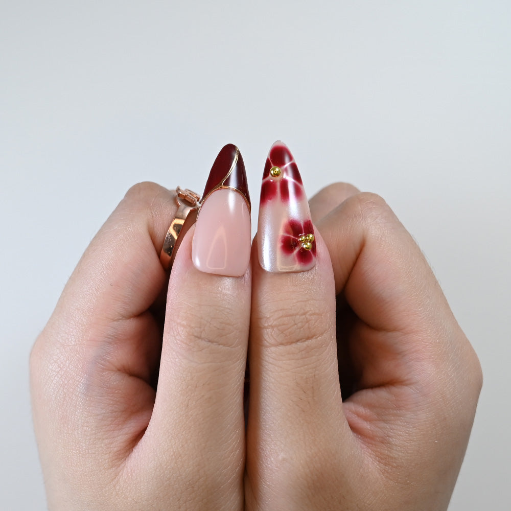 Inspired by blooming florals at twilight—deep wine tones meet black accents, gold lines, and 3D blossoms for a bold romantic look.