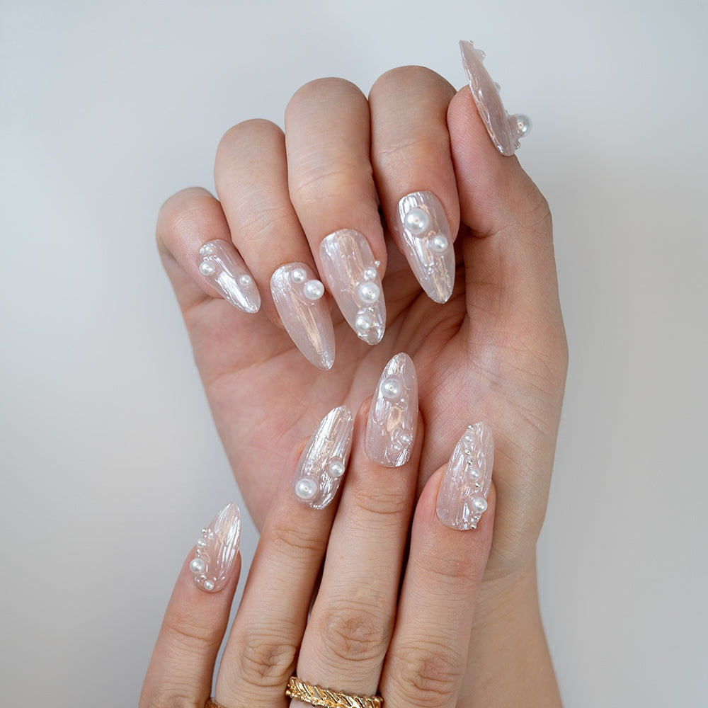 Shiny like melted glass and dotted with pearls, this nude design adds a soft, elegant shimmer to your fingertips.