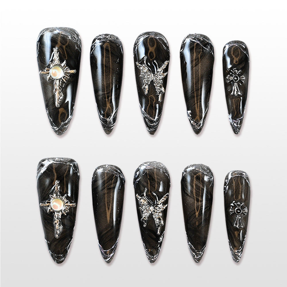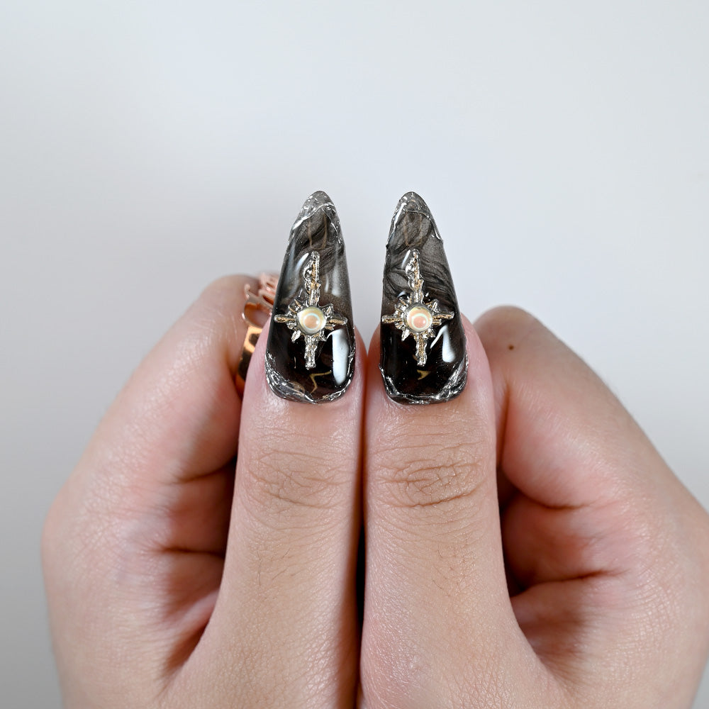 Inspired by dark marble stones and silver gothic emblems, this design fuses mystique, cross charm, and elegance in every detail.