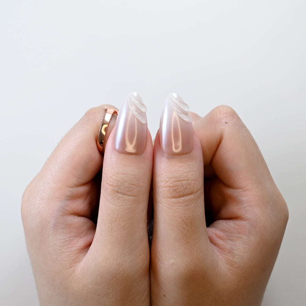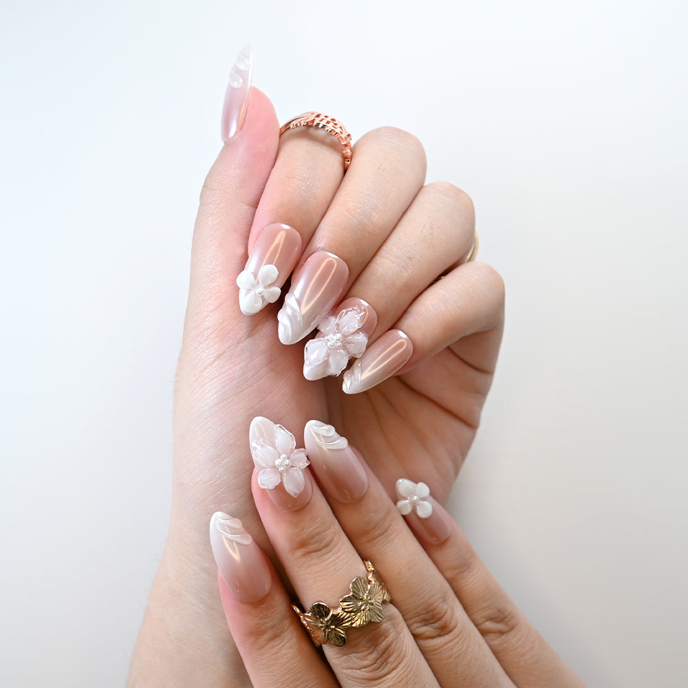 Inspired by soft bridal elegance, this set uses pearlescent nude tones with sculpted 3D white flowers to create a look that is both romantic and timeless.