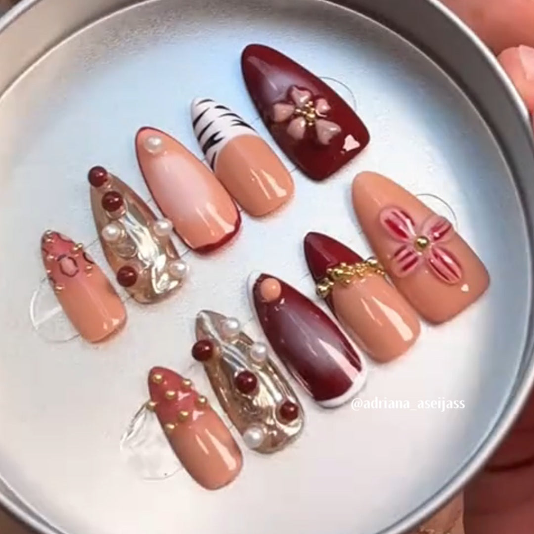 "Golden Bloom Luxe" combines rich red and peach tones, floral accents, gold embellishments, and pearls to evoke a luxurious and elegant aesthetic.