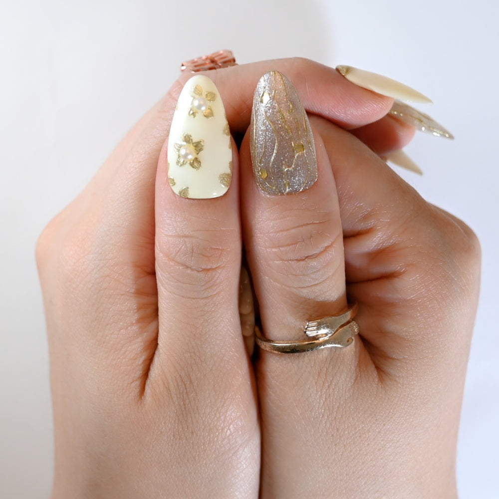 A refined blend of ivory, gold leaf, and glitter, with delicate pearl accents and metallic details—perfect for bridal elegance or luxe everyday glam.