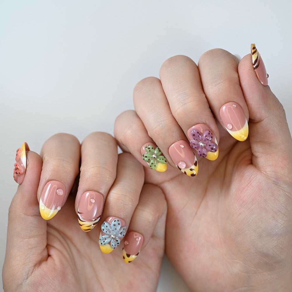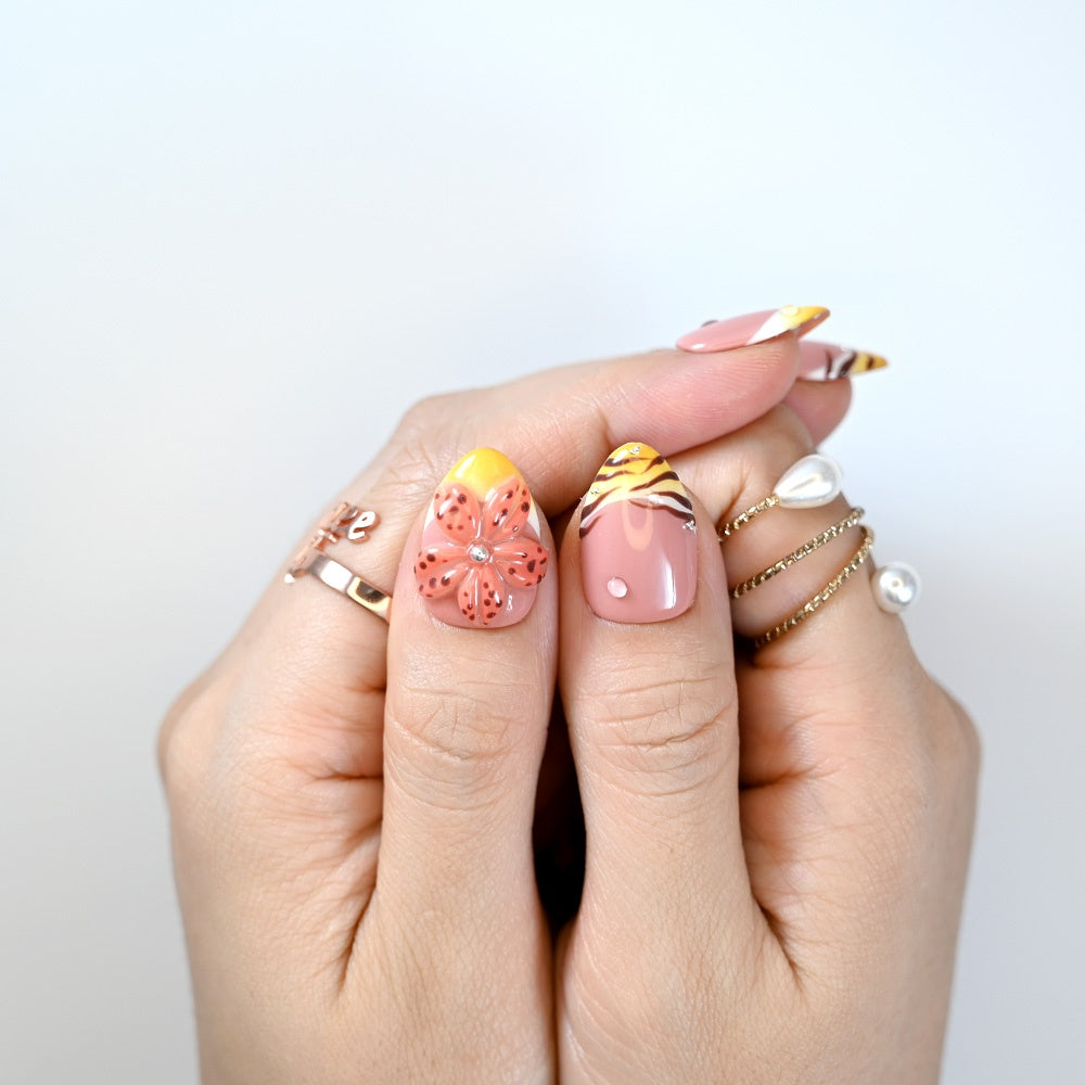 A wild blend of tiger stripes, sunflower tips, and jungle-toned florals—this bold, nature-inspired set brings summer safari vibes to your fingertips.