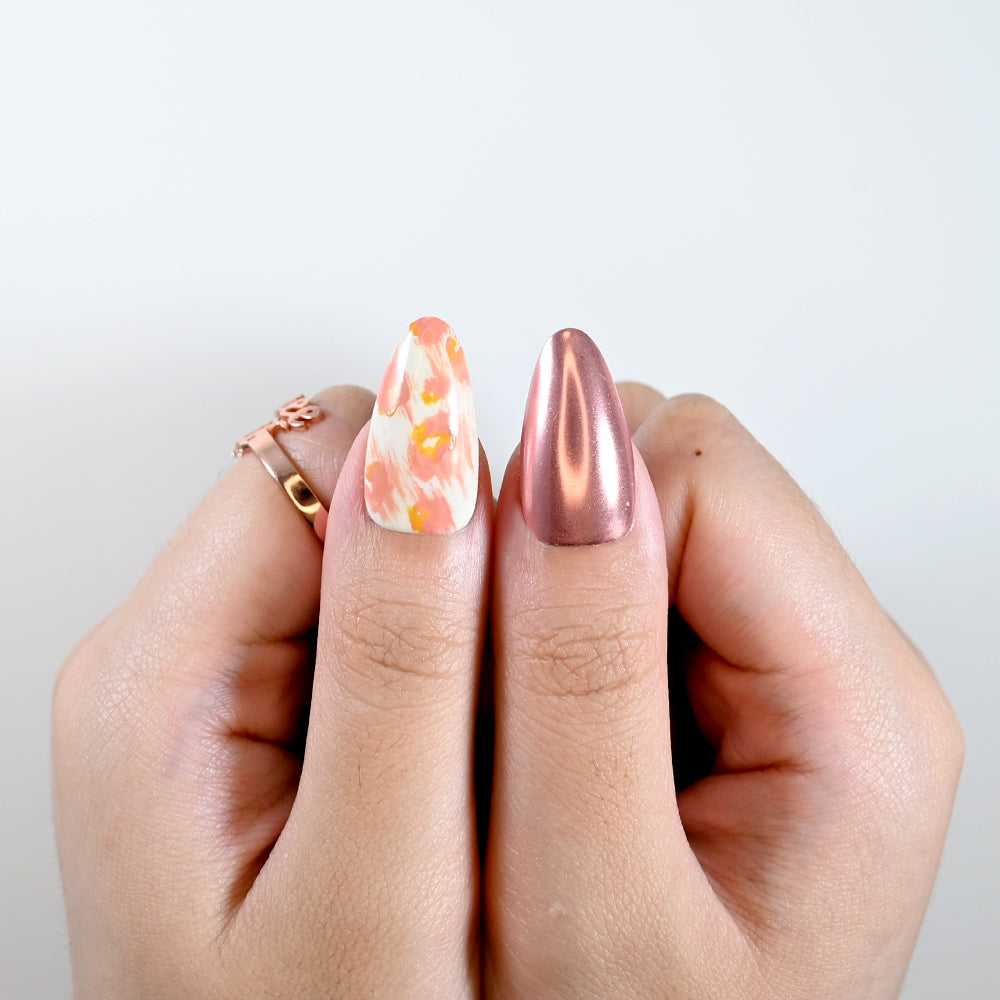 Inspired by abstract flower petals and playful confetti, this set blends painterly florals, holographic glitter, and chrome pink metallics for a lively, artsy look.
