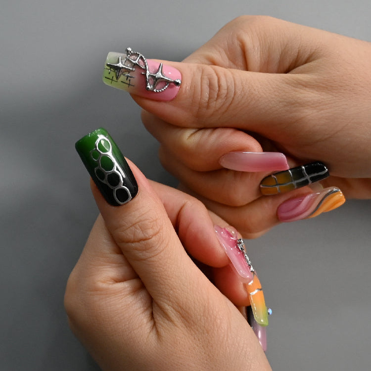 Inspired by Y2K pop vibes and metallic constellations. Playful gradients meet silver chrome details and vibrant charm studs.