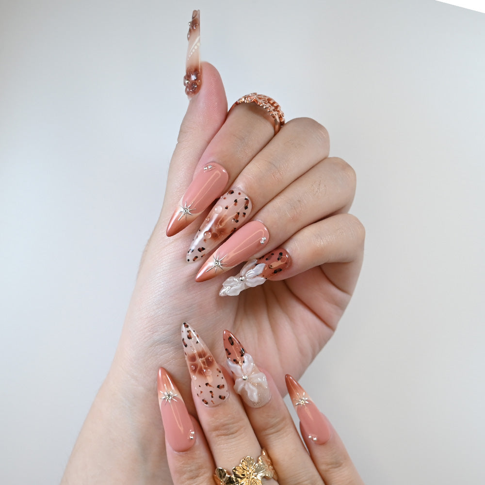 A flirty mix of soft nude tones, playful leopard spots, and romantic 3D florals. Designed for bold hearts and feminine vibes.