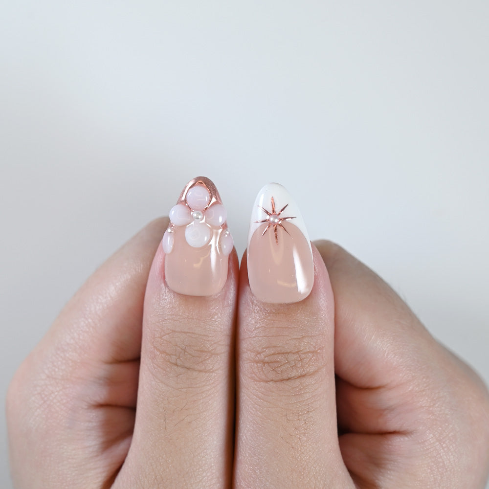 This set blends glossy blush tones with chrome swirls, 3D pearl flowers, and cross accents for a dreamy, celestial vibe. Soft yet bold, perfect for romantic souls who love starry details.